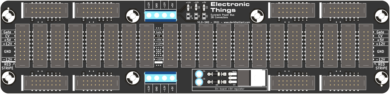 The Bus 28 is the biggest of all. With its 28 Eurorack connectors, you can supply a really big case! As always, the key is the short distance between each connector, which should improve the impedance between each of them. (To keep the impedance as low as possible, use the shortest ribbon cables available).