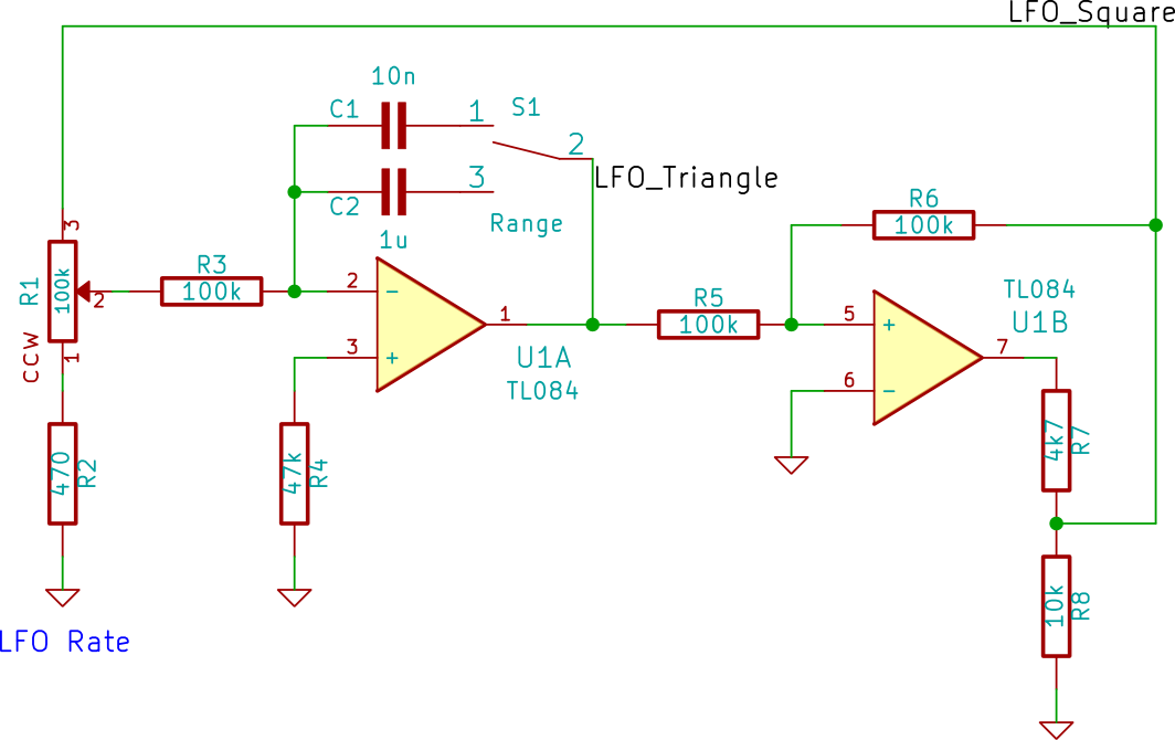 Many component values are not critical in the Simple LFO. It’s a robust circuit which can tolerate many experiments and modifications of the values.